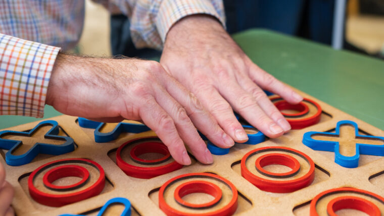 Gent amb discapacitat visual jugant als jocs de taula inclusius 3D