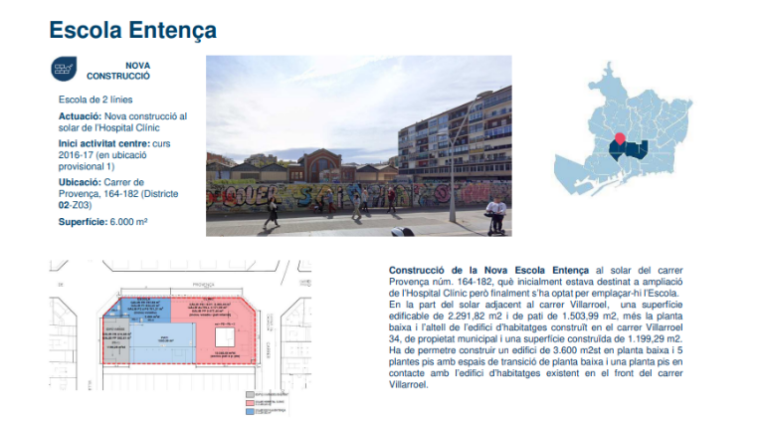 L’Escola Gaia s’ubicarà a les dues naus de l’antiga fàbrica de paraigües, al número 189 del carrer Dos de Maig. L’Escola Xirinacs, a una de les naus de La Model. L’Escola Entença es construirà a l’antic solar dels Bombers del carrer Provença, 178. La ubicació d’aquest tercer centre forma part d’un projecte més ampli, d’acord amb el qual la meitat del solar proper de l’antiga caserna es destinarà a l’edifici de l’escola i l’altre meitat a un equipament sanitari vinculat a activitats de l’Hospital Clínic.