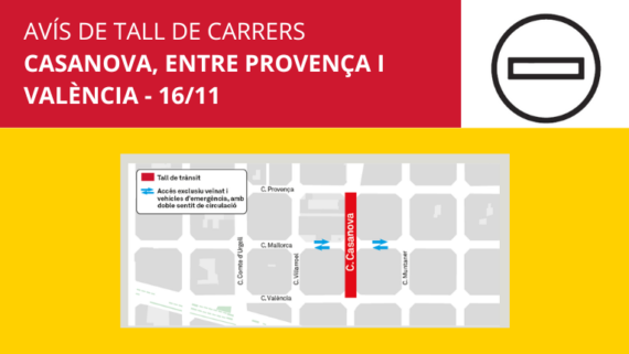 11/11/2025 - 23:07 h Urbanisme i infraestructures Tall de trànsit a Casanova, entre València i Provença, aquest diumengeAlguns carrers de l’entorn quedaran en atzucac, amb accés exclusiu per al veïnat i vehicles d’emergència