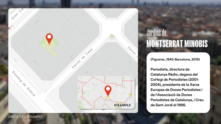 La periodista Montserrat Minobis (Figueres,1942-Barcelona, 2019) dará nombre al interior de manzana del antiguo Cine Novedades, entre las calles de Casp, gran vía de les Corts Catalanes, Pau Claris y paseo de Gràcia, en el barrio de la Dreta de l’Eixample. Minobis tuvo una larga trayectoria como periodista, fue directora de Catalunya Ràdio, decana del Col·legi de Periodistes (2001-2004), presidenta de la Red Europea de Mujeres Periodistas y de la Associació de Dones Periodistes de Catalunya, y Creu de Sant Jordi en 1996. Se reconoce su aportación al periodismo, a la lucha feminista, sobradamente difundida y reconocida, así como la defensa y promoción de la lengua catalana.