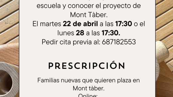 Dimarts 22 i dilluns 28 d’abril a les 17:30 farem les portes obertes de la nostra escola. Heu de demanar cita prèvia per telèfon al 93 441 75 36, cal trucar en horari escolar: de 9 h a 17 h o enviar...