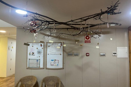 I també hi ha hagut moments de creació, per tal de deixar empremta a l'escola. I el resultat ha estat un mòbil amb moltes fustes que hem penjat a l'entrada de l'escola. En elles les famílies han escrit "Benvingudes" en les diferents llengües que es parlen a la nostra escola.