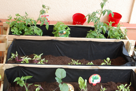 Se acondicionó una parte del patio, con huertos urbanos y torretas de madera, para disfrutar de plantas aromáticas, verduras y fruta roja .