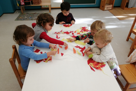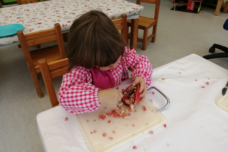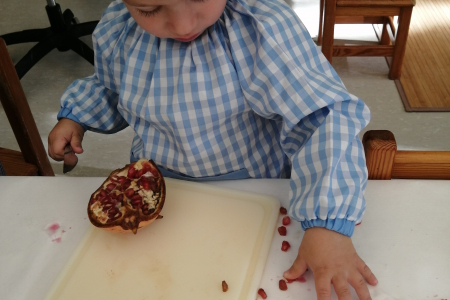 El otoño ha llegado a la Mar Xica y los mayores de la escuela, las Petxines, han disfrutado de diferentes propuestas como; el cuento de la castañera, canciones y danzas o propuestas plásticas y de experimentación con frutos típicos del otoño como son las granadas; son algunos de los ejemplos. A través de la experimentación i el modelaje los niños/as tienen la oportunidad de poner en juego y despertar los sentidos: mirar, tocar, probar, oler y manipular.