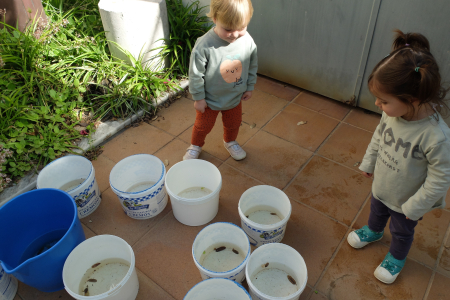 També hem investigat altres possibilitats per tenir aigua per regar, però volíem veure si queia aigua del cel. Els nens han gaudit de posar els galledes de diferents maneres, jugant amb formes.