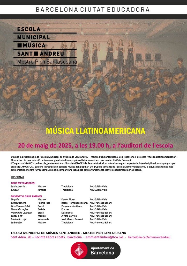 El grup SIMBIOSI i METAMORFOSI (Conjunts de Guitarres, Flautes de bec i percussions de l’escola) presenten el projecte MÚSICA LLATINOAMERICANA.