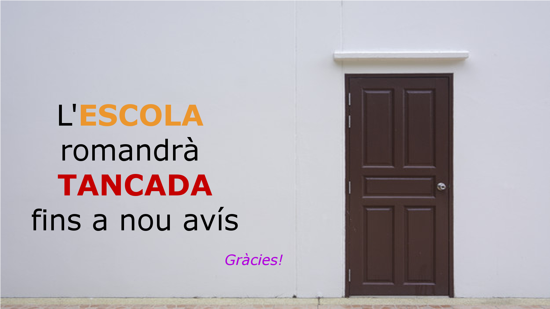 Tras la apertura de la secretaría de la escuela para apoyar el proceso de preinscripción y matrícula para el curso 2020-2021, el centro permanecerá cerrado a partir del 28 de mayo. Se informará, a través de este mismo medio, de la fecha en que se proceda a la reapertura de la escuela. Puede contactar a través de la dirección de correo electrónico: emmeixample@bcn.cat