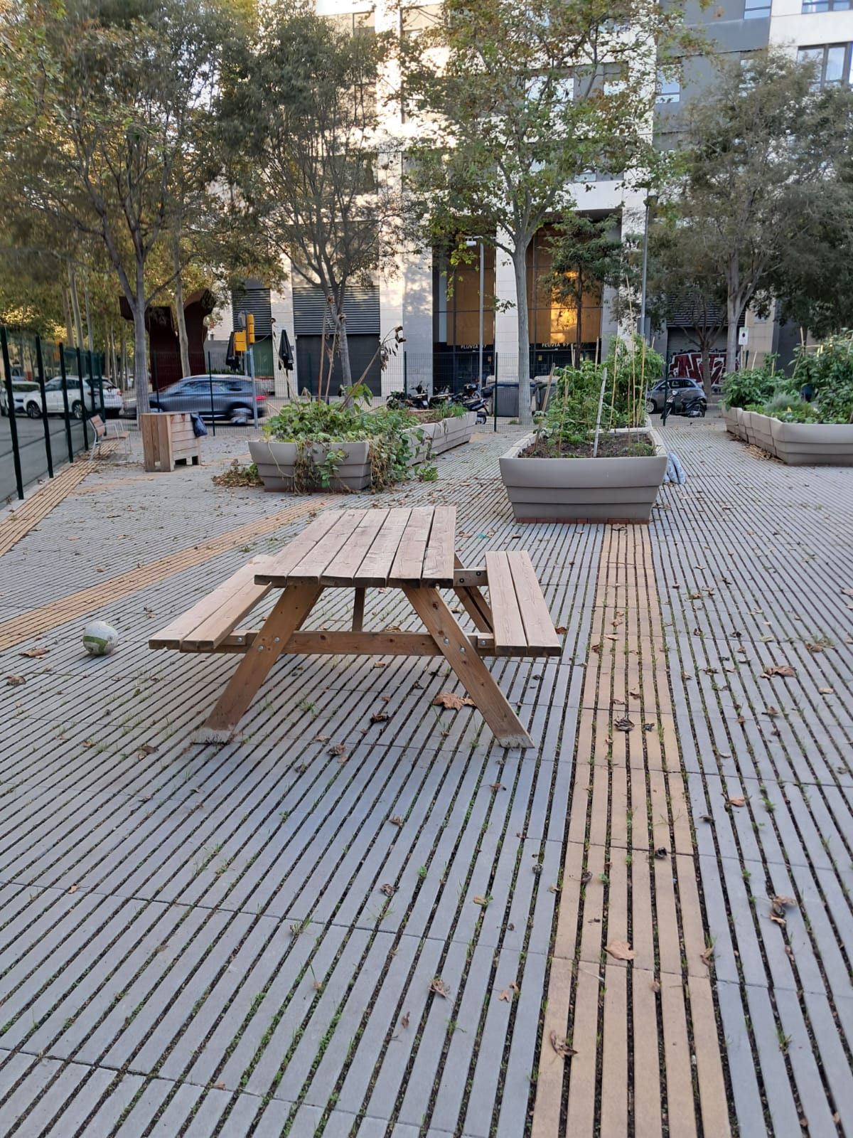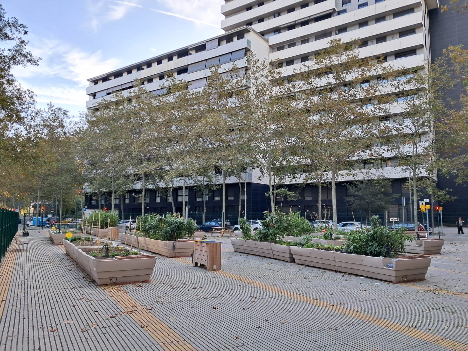 This allotment is located on a triangular 768 m2 plot on the side of Diagonal, at the corner of Carrer Fluvià and Carrer Pallars. The space has seven groups of large planters. Every planter has a tank that collects runoff water and a water pump to irrigate the allotment with collected rainwater or excess irrigation water. It also has benches and selective recycling bins.