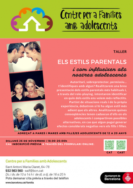 En el mes de noviembre realitzaremos “Estils parentals: com influeixen als nostres adolescents”, a cargo de los profesionales del Centro para familias con adolescentes, presentaremos e identificaremos los diferentes estilos. También contaremos con la presencia de los profesionales del SAH que realizaran un taller sobre paternidad consciente dirigida a hombres que son padres de hijos/as adolescentes.