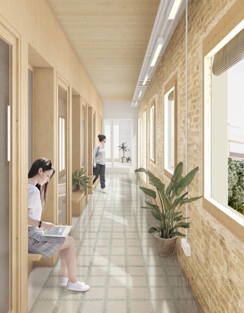 La rehabilitació també preveu deixar preparat l’edifici per acollir una galeria i una sala de lectura com a espais socials, i que alhora actuïn com a espai bioclimàtic per fer l’edifici sostenible sense necessitat de recórrer a sistemes de climatització.