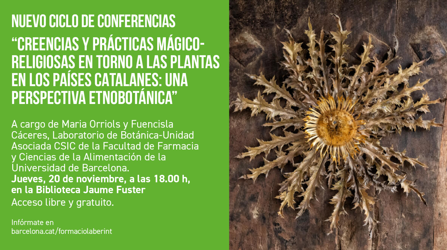 Abstract: Desde tiempos inmemoriales, las plantas han formado parte de la vida humana, no sólo por su valor medicinal y alimentario, sino también por las creencias relacionadas con ellas y el simbolismo que se les atribuye. En los Països Catalans, este conocimiento tradicional se ha transmitido de generación en generación –generalmente de forma oral– hasta nuestros días. Sin embargo, actualmente esta transmisión corre el riesgo de verse interrumpida antes de llegar a las generaciones más nuevas. En esta ponencia, nos proponemos dar a conocer las especies vegetales más relevantes en el contexto de las creencias y prácticas mágico-religiosas, poniendo especial énfasis en su papel como protectoras, maléficas o portadoras de prosperidad o de desgracia dentro de la visión popular. A partir de los datos recogidos en la base de datos de acceso abierto 'Etnobotánica dels Països Catalans' (https://etnobotanica.iec.cat), resultado de la investigación etnobotánica iniciada en 1990 por el grupo de investigación en etnobotánica de la Universidad de Barcelona y el Instituto Botánico de Barcelona, se han identificado las que se derivan. Entre ellas, destaca el laurel (Laurus nobilis L.; 10,31%), muy utilizado en la tradición cristiana de bendecir el ramo el Domingo de Ramos; el olivo (Olea europaea L. var. europaea; 4,47%), sobre todo por los múltiples usos del aceite, y el romero (Salvia rosmarinus L.; 3,64%), al que se atribuyen propiedades protectoras contra las adversidades climáticas y de otros tipos. Del mismo modo, aunque quizás no tan citadas por nuestros informantes, destacan otras plantas por la originalidad de su uso, como la carlista (Carlina acanthifolia All. y Carlina acaulis L.), muy utilizada en todo el Pirineo catalán para proteger las casas contra brujas y malos espíritus. Estos resultados ponen de manifiesto la relación profunda entre naturaleza y cultura, mostrando cómo las supersticiones y creencias tradicionales siguen influenciando prácticas actuales. Este estudio reivindica la importancia de conservar este legado inmaterial, no sólo por su valor patrimonial y científico, sino también con el compromiso de devolverlo a las comunidades que lo han transmitido, asegurando así su continuidad y reconocimiento.