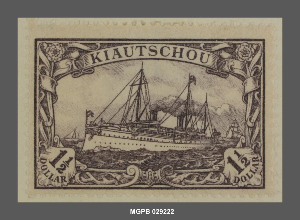 Tipus de segell emès per a la seva distribució a l'antiga colònia alemanya de Kiautschou (Kiauchau), situada a la península xinesa de Shandong. Segell de 1900 reemès amb un nou valor en dòlars.