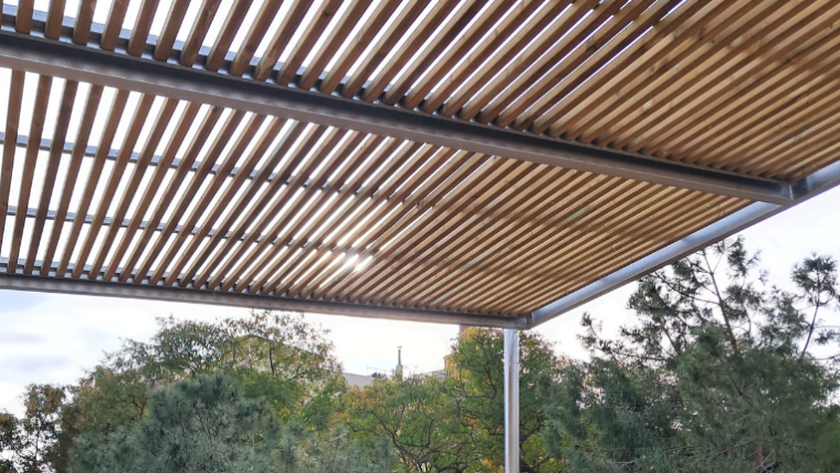 La pèrgola que dota d’ombra a la tarima és de caire lleuger, permeable i està feta de fusta de pi i acer. Té unes dimensions de 7,56 x 5 metres, i una alçada des del terra d’entre 3,2 i 3,6 metres (depenent de la inclinació del terreny).