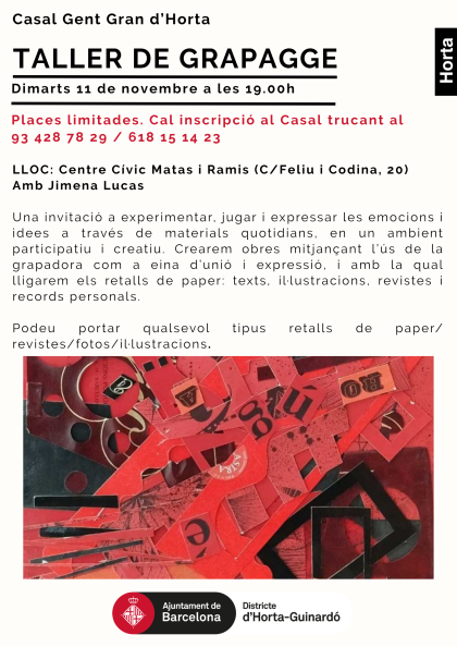 Una invitació a experimentar, jugar i expressar les emocions i idees a través de materials quotidians, en un ambient participatiu i creatiu. Crearem obres mitjançant l’ús de la grapadora com a eina d’unió i expressió, i amb la qual lligarem els retalls de paper: texts, il·lustracions, revistes i records personals.