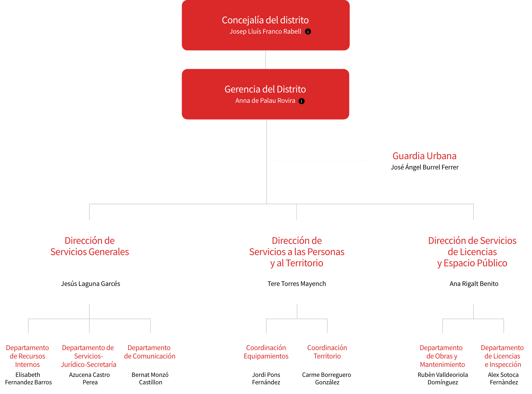 La estructuración en distritos del Ayuntamiento de Barcelona ha acercado la gestión municipal cotidiana a todos los rincones de la ciudad. Cada uno de los diez distritos dispone de una estructura ejecutiva diferenciada de la de los servicios centrales y disfruta de amplia autonomía.