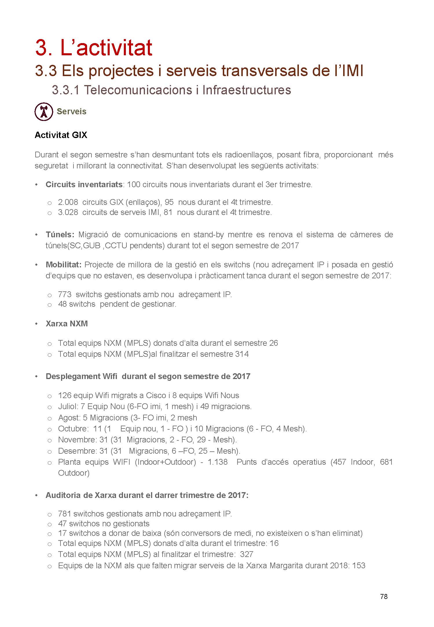 Memòria 2017 L'Institut Municipal d'Informatica L'IMI com a principal proveïdor de solucions TIC Percepció municipal de la qualitat dels serveis i projectes gestionats per l'IMI L'estructura organitzativa La gestió de serveis TIC en dades El pressupost La Transformacio Digital de l'Ajuntament Programa de Digitalització Oberta i Desenvolupament Àgil de Serveis El Pla de Transformació Digital 2017 - 2019 L'activitat Els projectes sectorials Gerència Municipal Gerència de Drets de ciutadania, Participació i Transparència Gerència d'Ecologia Urbana Gerència de Presidència i Economia Gerència de Drets Socials Gerència de Recursos Gerència de Seguretat i Prevenció Gerència d'empresa, Cultura, Innovació Cooperació internacional Esdeveniments i delegacions Projectes europeus Els projectes i serveis transversals de l'IMI Telecomunicacions i Infraestructures Operacions i Sistemes Qualitat i Seguretat Desenvolupament Informació de Base i Cartografia Estratègia i Nous Projectes Representació TIC i Reconeixements / 127 Image Image Image Image Image Image Image Image Image Image Image Image Image Image Image Image Image Image Image Image Image Image