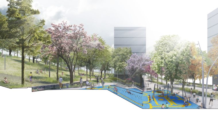 Mientras que en el del ámbito de ‘las terrazas’, se trata de un espacio lineal entre edificios, con la función de calle para peatones. Un espacio que servirá para circular de un edificio al otro, acompañando a los transeúntes y ofreciendo espacios sombreados en verano y claros soleados en invierno.