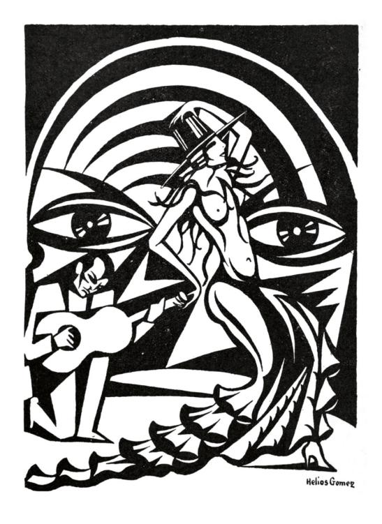 Futurista, orientalista, populista, la manera de fer d’Helios Gómez desfà magníficament aquest malentès —tan productiu—, que, tal com va advertir Fredric Jameson, es dona entre modernitat i modernisme en els àmbits culturals d’Espanya i l’Amèrica Llatina. Com a resultat, potser, no hi ha cap artista que, des de la cultura gitana, a més, personifiqui tan bé la visió del futur i la revisió del passat, imprimint aquestes energies anacronistes en les lluites polítiques del temps que li va tocar viure. Helios Gómez agafa la seva força dels passats oblidats i dels futurs imminents, que diria José Esteban Muñoz, i les seves estampes, negre sobre blanc, constaten, sobretot, la negació de l’estat de coses que va marcar el seu present.