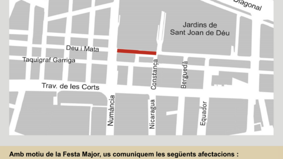 01/10/2025 - 10:36 h Talls de trànsit del primer cap de setmana de Festa MajorUs informem de diferents afectacions al trànsit i talls de carrer amb motiu de la Festa Major de les Corts.