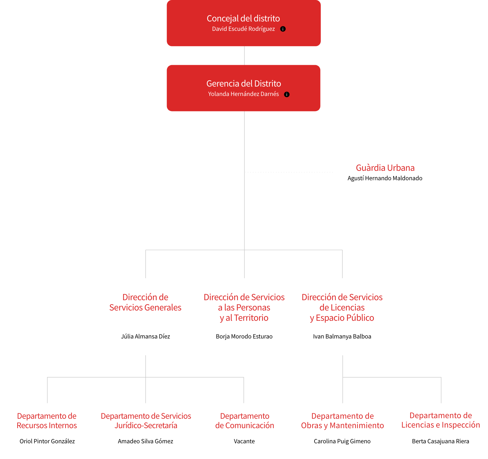 La estructuración en distritos del Ayuntamiento de Barcelona ha acercado la gestión municipal cotidiana a todos los rincones de la ciudad. Cada uno de los diez distritos dispone de una estructura ejecutiva diferenciada de la de los servicios centrales y disfruta de amplia autonomía.