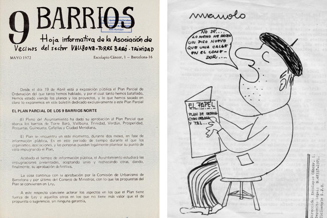 La toma de conciencia de los ciudadanos ante estas carencias desembocó en el nacimiento, en 1970, de la Asociación de Vecinos de Nou Barris, una entidad pionera en la lucha contra los planes parciales y por la mejora de las condiciones de vida y las libertades democráticas. Este nombre, lleno de ecos de lucha y conciencia ciudadana, se adoptó como nombre del distrito cuando en 1984 se hizo la actual división territorial. A continuación, imágenes de la hoja informativa de la asociación.
