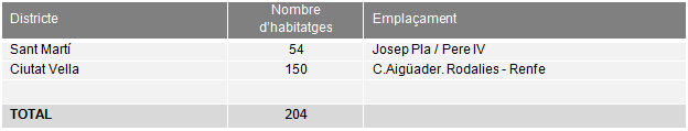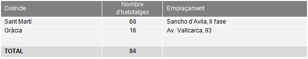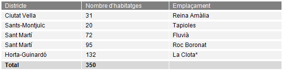Aquesta és la sisena promoció d’habitatges en dret de superfície promoguda pel Patronat Municipal de l’Habitatge que es lliura a la ciutat de Barcelona. Les primeres que es van adjudicar van ser les del C/ Reina Amàlia (31 habitatges), Tapioles, 79 (20 habitatges) i C/ Fluvià 94 (72 habitatges), C/ Roc Boronat 108, (95 habitatges), La Clota (132 habitatges).