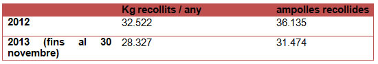 En els primers 11 mesos de 2013 s’han recollit 28.327 kg d’ampolles (31.474 unitats recollides) a la xarxa de punts verds de la ciutat. L’any passat es van recollir 35.522 kg en total, el que marca una tendència de disminució del 5%.