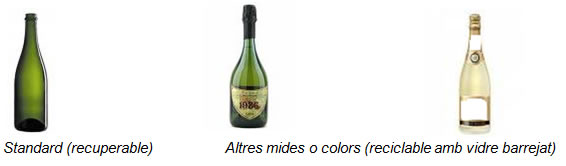 Les ampolles de cava que es poden reutilitzar són les de mida estàndar, les ampolles de 750 mil·lilitres, de color verd i no setinades, i sense gravats personalitzats.