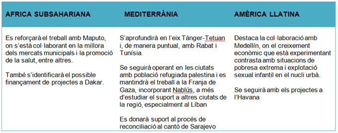 El Pla de Treball del 2014, que avui s’ha presentat a la Comissió de Presidència i Règim Interior, preveu mantenir l’aposta per aquells projectes que es desenvolupen en entorns urbans, prioritzant també la concentració geogràfica amb l’objectiu d’assolir un major impacte de les accions desenvolupades. Les àrees d’actuació prioritària, definides pel Pla Director de Cooperació al Desenvolupament, són l’Àfrica Subsahariana, la regió Mediterrània i el subcontinent Llatinoamericà.