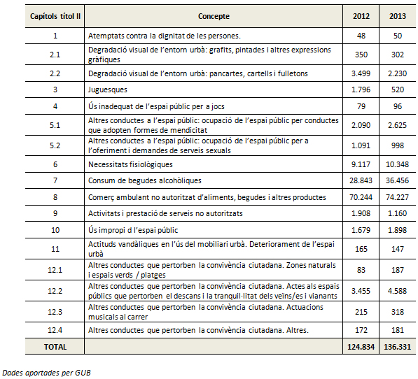 Fruit d’aquesta actuació durant aquest any els agents del cos de policia barceloní han posat un total de 136.331 denúncies per infraccions de l’Ordenança de Mesures per Fomentar i Garantir la convivència Ciutadana a l’Espai Públic de Barcelona. La xifra suposa un increment del 9,20% respecte l’any 2012.