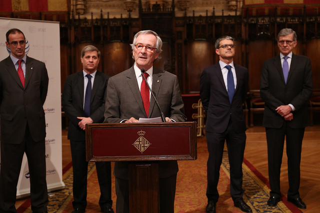 L’alcalde Xavier Trias ha rebut aquesta tarda a l’Ajuntament de Barcelona una delegació de la Cambra de Comerç Americana a Espanya, AmChamSpain amb motiu del Mobile World Congress. A l’acte hi eren presents James Ostos, ambaixador dels Estats Units a Espanya i Andorra i president honorari de la Cambra de Comerç Americana a Espanya;; Jaime Malet, president d’ AmChamSpain; Randall Stephenson, president d’ AT&T; John Hoffman, GSMA; i els tinent d’alcalde Antoni Vives.