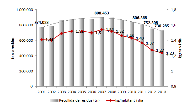 L’any 2013 es van recollir 730.285 tones de residus a la ciutat de Barcelona. Això representa un 2’9% menys que al 2012, quan es van recollir 753.695 tones. També baixa lleugerament l’índex de generació de residus per càpita, que se situa als 1’23 kg/persona/dia, quan al 2012 estava a 1’27 kg/habitant/dia. De fet, el 2013 és el sisè any consecutiu que es registra un descens en el volum total de residus recollits a la ciutat.