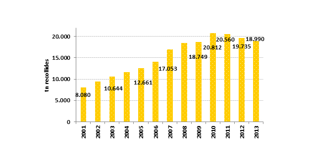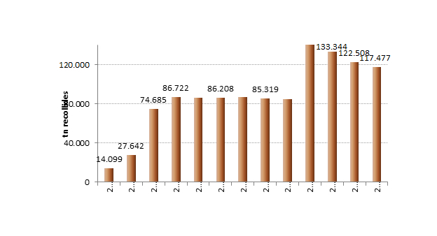 Vidre: al 2013 es van recollir 32.592 tones de vidre, un 0’15% més que al 2012, quan es van recollir 32.543 tones als contenidors verds.