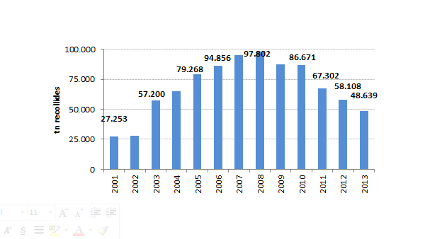 Al 2013, s’han recollit 117.477 tones de matèria orgànica, davant les 122.508 tones de 2012. La recollida de fracció orgànica baixa un 4’1% respecte l’any anterior. Dins del volum recollit, la qualitat de la fracció orgànica recollida baixa lleugerament, passant del 20’2% al 21’1% i es manté des de 2010 al voltant del 20% d’impropis -la brutícia que s’hi llença per error entre l’orgànica-.