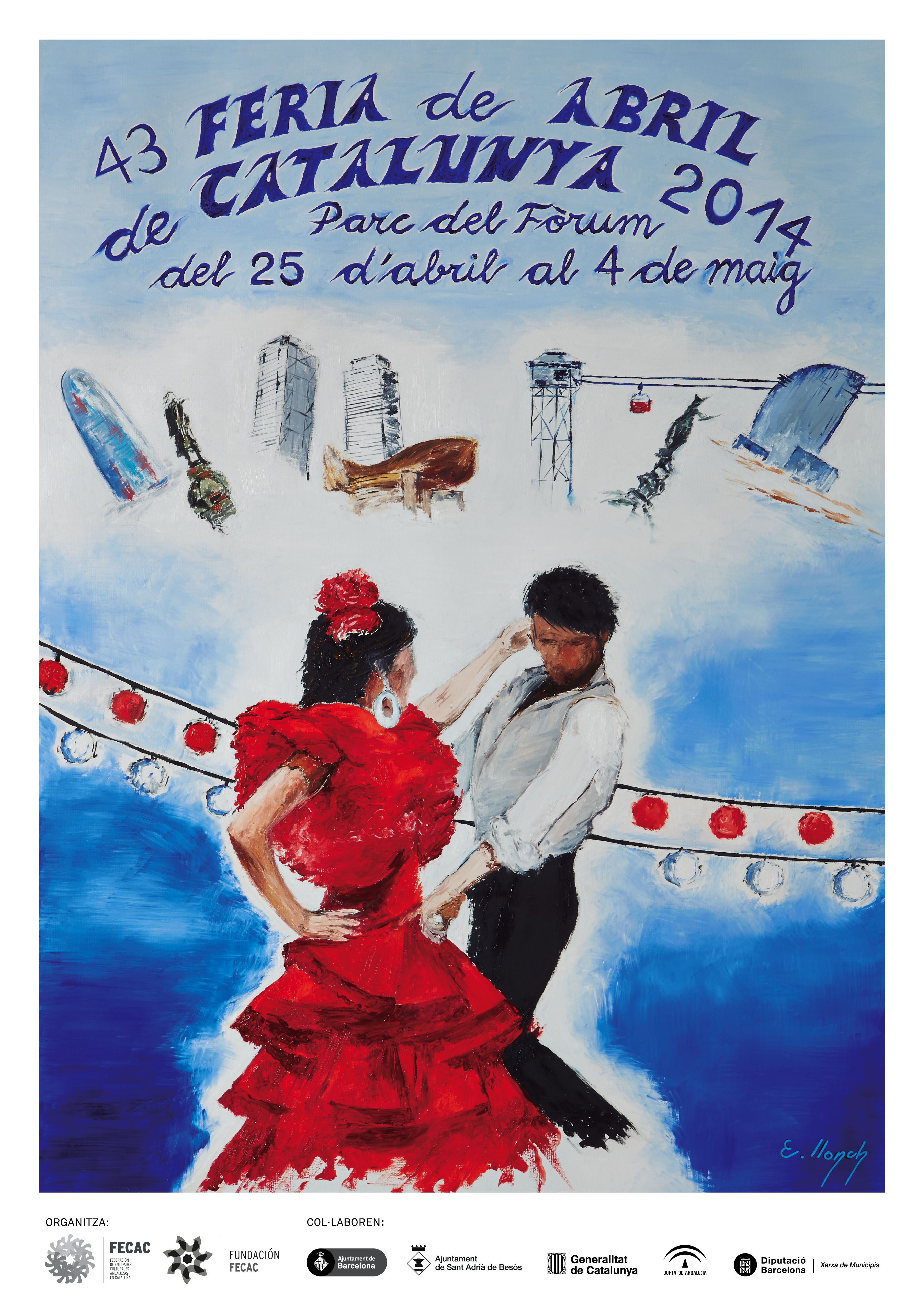 Elisenda Llonch, autora del cartell de la 43a edició de la Feria de Abril, ha explicat que es tracta d’una fusió entre imatges: una parella ballant i alguns dels edificis més emblemàtics de l’entorn. “És una proposta on tots els elements estan en moviment”, ha explicat. Elisenda Llonch és una artista nascuda a Barcelona, on treballa i resideix actualment. Encara que els seus estudis anaven encaminats cap al Disseny de Moda, finalment, va prendre una decisió definitiva en la seva trajectòria artística i es va decantar per les Belles Arts, seguint la seva vocació innata i la seva gran passió: el dibuix i la pintura. Les tècniques que treballa són el carbó, l’oli i l’acrílic, entre d’altres.