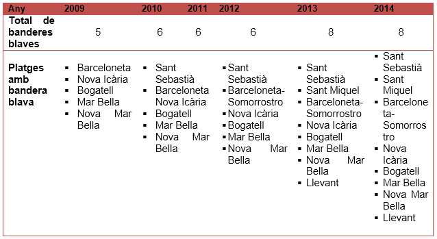 L’Ajuntament de Barcelona ha obtingut la Bandera Blava per a les 8 platges de la ciutat: Sant Sebastià, Sant Miquel, Barceloneta-Somorrostro, Nova Icària, Bogatell, Mar Bella, Nova Mar Bella i Llevant. Per segon any consecutiu, totes les platges de la ciutat obtenen aquest distintiu, que posa en valor les bones pràctiques a les platges urbanes. La certificació, que cada estiu atorga la Fundació Europea d’Educació Ambiental (ADEAC-FEEE), acredita la netedat de l’aigua i la sorra, la facilitat d’accés, l’absència de vehicles circulant, serveis i senyalització adequats i la realització de campanyes i activitats d’educació ambiental.