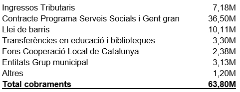 D’aquests 63,80M transferits per la Generalitat de gener a setembre, 46,83M s’han fet efectius mitjançant el Fons de Liquiditat (FLA) de l’Estat destinat a les Comunitats Autònomes per atendre els pagaments pendents amb les corporacions locals. Els cobraments corresponen a les partides que figuren a continuació: