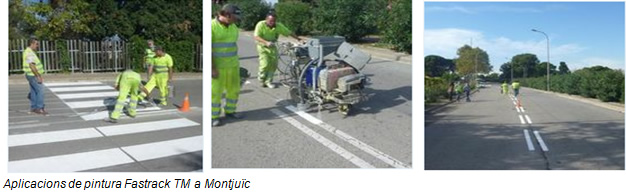 L’Ajuntament incentivarà als seus aplicadors a la utilització d’aquests materials, més segurs i ecològics, davant d’altres tecnologies convencionals, després d’haver realitzat una prova pilot amb la pintura Aqualine City, desenvolupada per Marcas Viales amb la tecnologia Fastrack TM de Dow Coating Materials i la col·laboració dels serveis tècnics municipals. Les proves es van realitzar a diversos espais de la muntanya de Montjuïc, sotmesos a una càrrega de trànsit de vehicles i vianants corresponent a la mitjana d’un carrer estàndar de la ciutat.