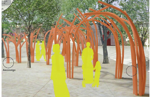 La nova plaça estarà íntimament lligada amb l’edifici del centre cívic. De fet, el mateix centre cívic ja busca una relació molt clara amb l’espai exterior a través de les seves visuals orientades a la plaça. El nou espai públic s’ha concebut com un àmbit de relació i de passeig, una continuació del centre cívic a l’aire lliure.