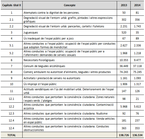 Fruit d’aquesta actuació durant aquest 2014 els agents del cos de policia barceloní i els Mossos d’Esquadra han posat un total de 136.534 denúncies per infraccions de l’Ordenança de Mesures per Fomentar i Garantir la convivència Ciutadana a l’Espai Públic de Barcelona. L’any passat la xifra dels dos cossos policials va ser de 138.726.