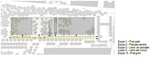 Aquesta pastilla central constarà de cinc espais connectats entre ells. A l’espai 1 trobem el prat petit, un lloc d’estada i joc, amb un suau pendent que permet ser utilitzat com a espai d’espectacles infantils o d’altres, i on s’aprofitarà el desnivell creat en relació a l’espai central, que actua com a escenari; l’espai 2 l’ocupa la placeta central, que serà l’àmbit de referència del parc, en el que conflueixen l’eix Nord- Sud, la frontissa i el mirador dels dos prats; a l’espai 3, i després de baixar un desnivell de 2,25 m. s’hi ubica l’anomenat jardí en pendent (aquí, s’hi accedirà a través de dues escales laterals i una rampa creuada en la diagonal del rectangle), permetent l’accessibilitat a persones amb dificultat de mobilitat, cotxets de nens, etc; el 4 inclourà el jardí del SUDS (Sistema Urbà de Drenatge Sostenible) que permetrà retornar a l’aqüífer les aigües de pluja del conjunt de l’illa (cobertes i espai públic); i finalment, l’espai 5 tindrà la denominació de prat gran, definit amb dos murs vegetals (un de vermell, que farà de barana del passeig arbrat perimetral; i el verd, límit de la franja pavimentada i d’estada).