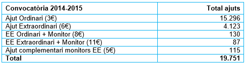 – Ajut ordinari: fins a un màxim de 3 euros/dia. Per a totes aquelles sol·licituds que compleixen els requisits de la convocatòria i no assoleixen el llindar de l’ajut extraordinari.