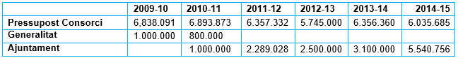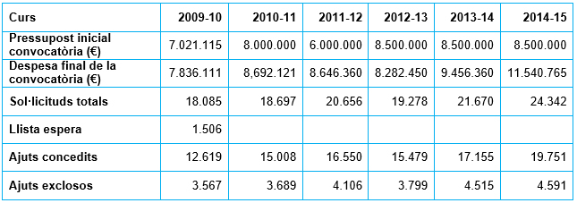 La convocatòria oberta per al curs 2015/16 té una dotació pressupostària inicial de 8.500.000€. D’aquest pressupost 6.000.000€ són aportació del Consorci i 2.500.000 d’aportació extraordinària de l’Ajuntament, que ja té compromesos 3.000.000€ més per cobrir el nivell de demanda del curs anterior. Amb els 2,8 milions addicionals que ara s’acorden, la despesa total prevista per al curs 2015/16 serà de 14,3 milions d’euros, un 24% més que el curs anterior.