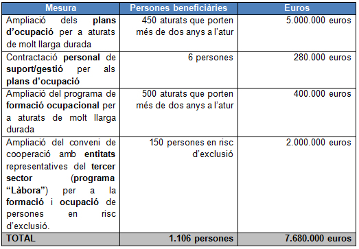 En l’àmbit de la ocupació i per impulsar mesures de xoc, la modificació pressupostària inclou 7.680.000 euros per a polítiques actives d’ocupació destinades als aturats de molt llarga durada i persones en risc d’exclusió de la ciutat (veure quadre adjunt):