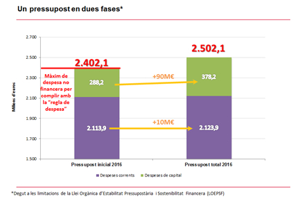 El projecte de pressupostos 2016 contempla la seva execució en dues fases per tal de poder fer front a les limitacions de la Llei Orgànica d’Estabilitat Pressupostària i Sostenibilitat Financera (LOEPSF). En concret es contempla un pressupost inicial i un pressupost consolidat que sorgirà d’una modificació pressupostària que ja incorporarà 100 milions de superàvit. Amb aquetsa fórmula es podrá cumplir en tot moment la llei, evitar les limitacions que fixa l’Estat, complir la regla de despesa i tancar, al mes de març, el Pla Econòmic Financer (PEF).