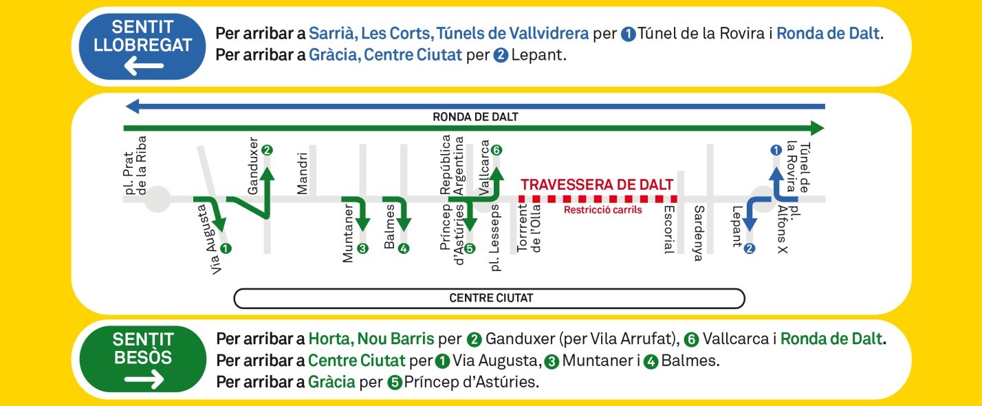 – Pels vehicles que es dirigeixin a la zona de Sarrià, les Corts o els Túnels de Vallvidrera es recomana utilitzar el Túnel de la Rovira i la Ronda de Dalt.