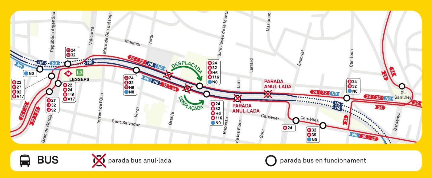Aquesta nova fase d’obres també ha comportat l’anul·lació i el desplaçament d’algunes de les parades de bus de les línies 24, 32, H16, 116 i N0 de la Travessera de Dalt, en ambdós sentits.