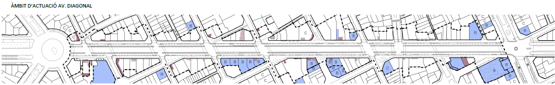 Fins ara, aquest tram de l’avinguda Diagonal no ha tingut terrasses, a excepció dels eixamplaments en les confluències amb alguns carrers, ja que les dimensions de les voreres existents no ho permetien. Amb la remodelació que s’ha dut a terme, l’amplada de les voreres s’amplia a 7 metres, fet que obre la porta a la instal·lació de terrasses i que requereix la seva ordenació.
