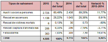 El nombre de salvaments van augmentar en un 9,48%respecte l’any anterior, passant de 4.155 salvaments l’any 2014 als 4.505 al 2015. En el 74,49% dels serveis de salvament es va arribar en un temps inferior de 5 minuts.