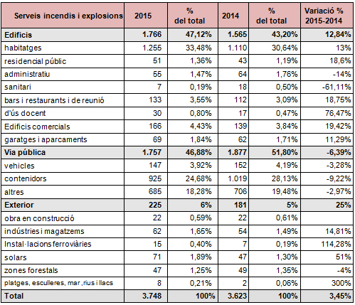 De les 3.748 intervencions, 1.766 es van realitzar en edificis, el que representa el 47,12% del total. D’aquestes el 33,48% corresponen a incendis o explosions en habitatges. El 46,88% dels serveis, 1.757, es van originar a la via pública, dels quals el 24,68% fan referència a incendis en contenidors. La resta, el 6%, són serveis realitzats a l’exterior, dels quals 47, el 1,25% fan referència a zones forestals, 2 menys que l’any passat, mantenint la tendència a la baixa d’aquests serveis durant els últims anys.